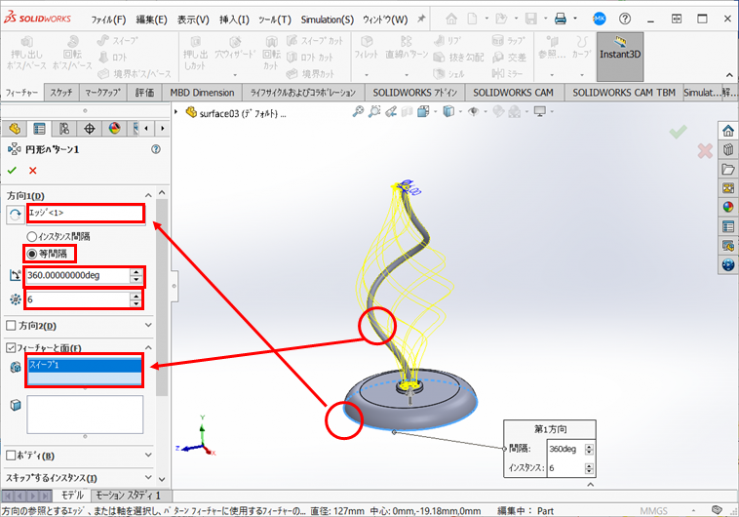 角度:360deg、インスタンス数:6、【フィーチャーと面】を選択し、 5.で作成したスイープフィーチャーを選択し、【OK】をクリックします。
