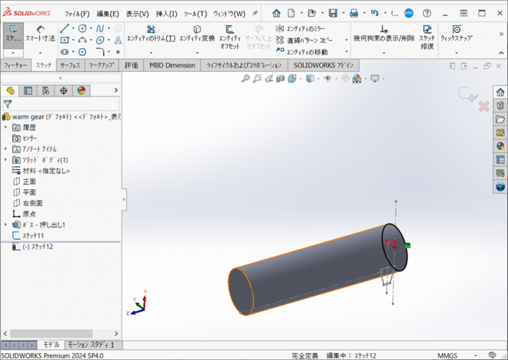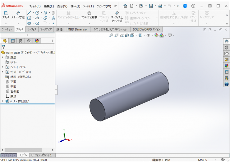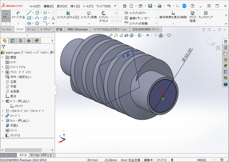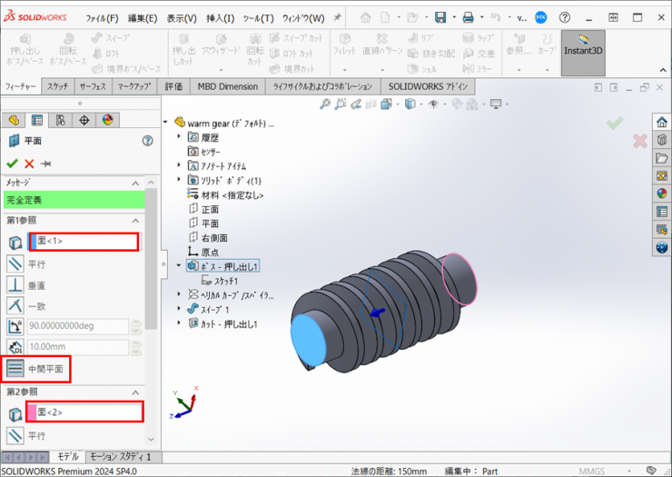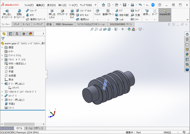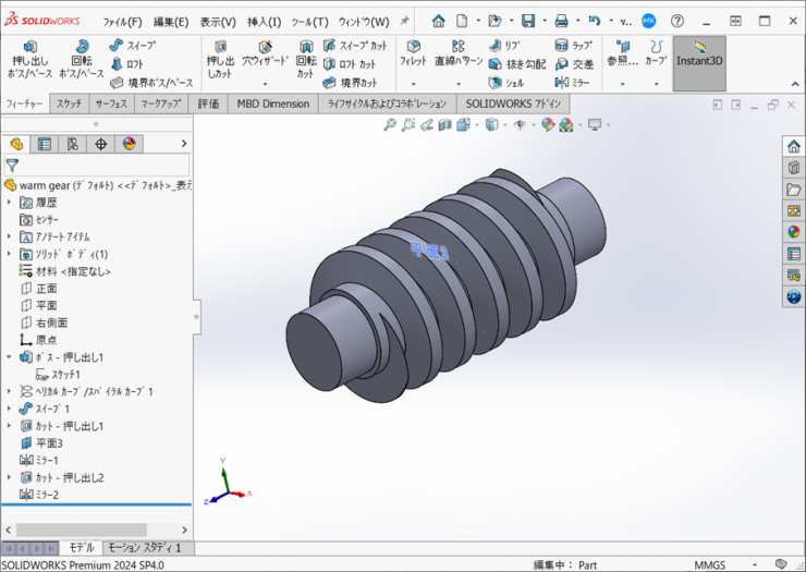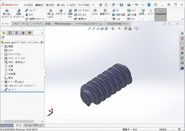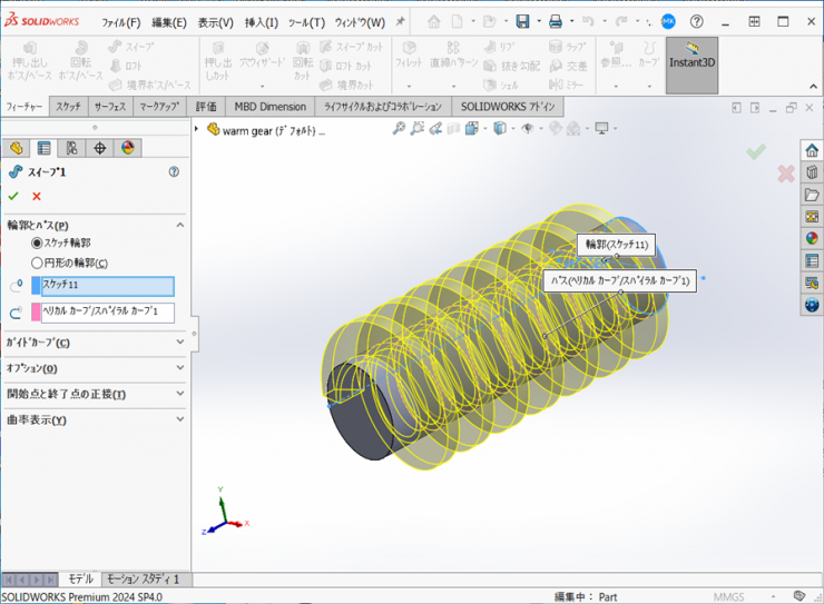 ①フィーチャータブの【スイープ】アイコンをクリックします、【OK】をクリックして、ねじ山を作成します。
