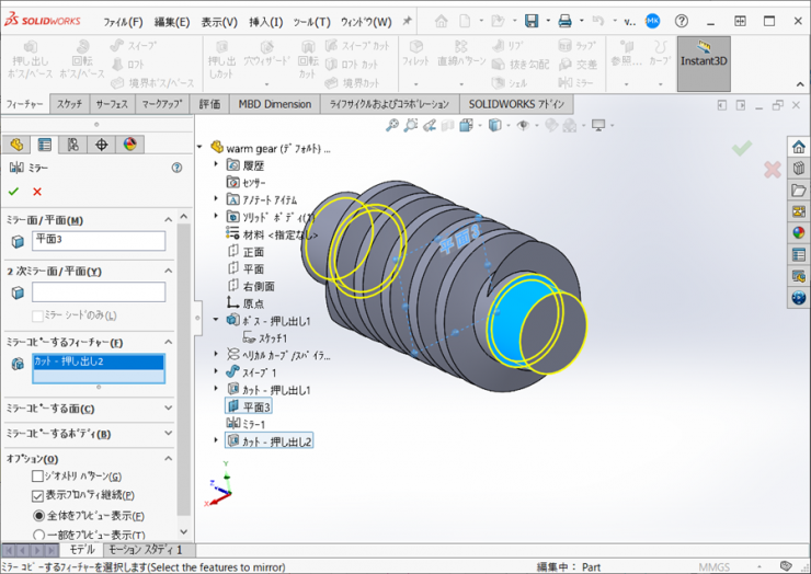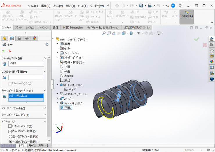 ⑤ミラー面/平面に③で作成した平面を選択し、ミラーコピーするフィーチャーにカットフィーチャーを選択します。