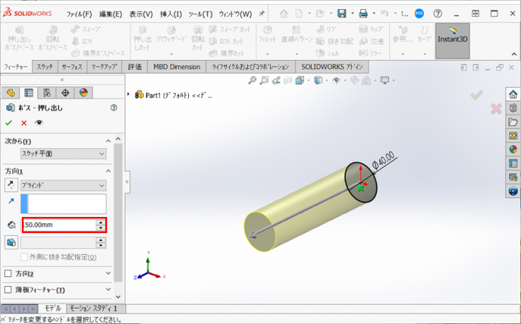 4.フィーチャータブの【押し出し ボス/ベース】アイコンをクリックします。