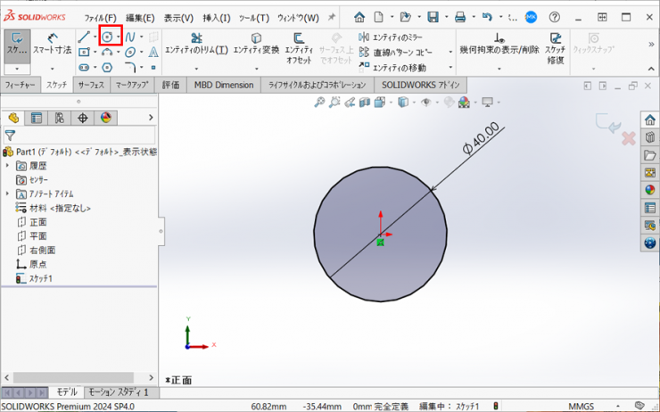 3.スケッチタブの【円】アイコンをクリックし、下図のように原点が中心で、φ40の円を作図します。