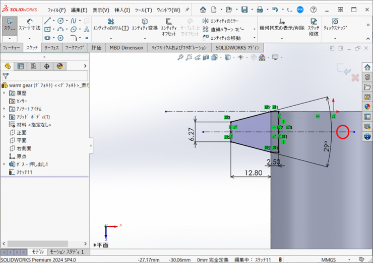 ※赤丸の中心線に対し、対称です。スケッチが作図できましたら、スケッチを終了します。