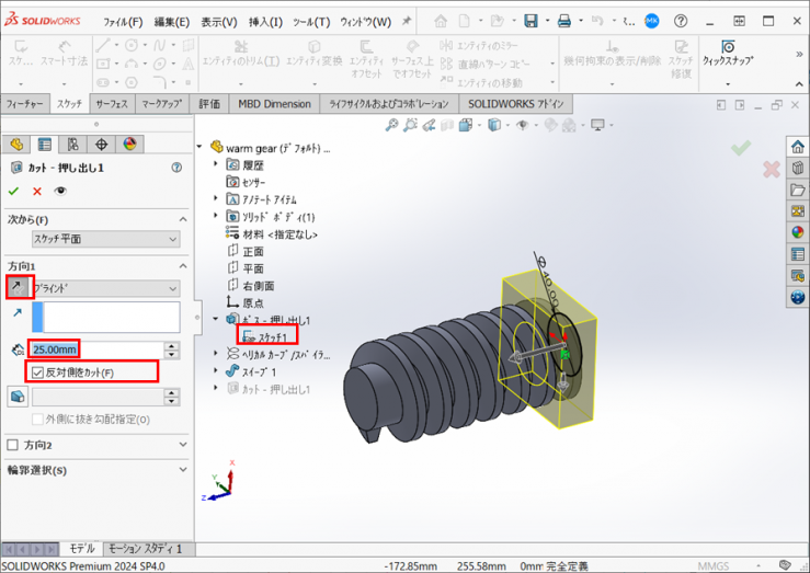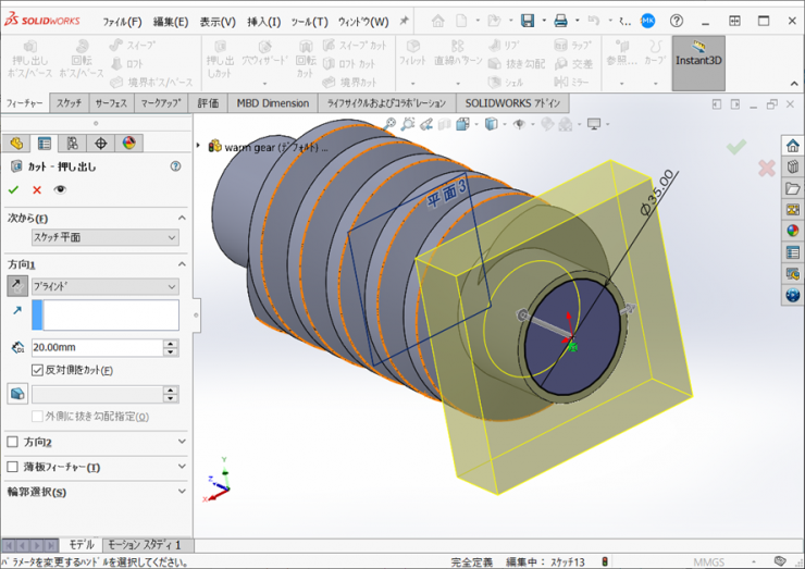 ①1.で作図したスケッチを選択し、フィーチャータブの【押し出しカット】アイコンをクリックします。