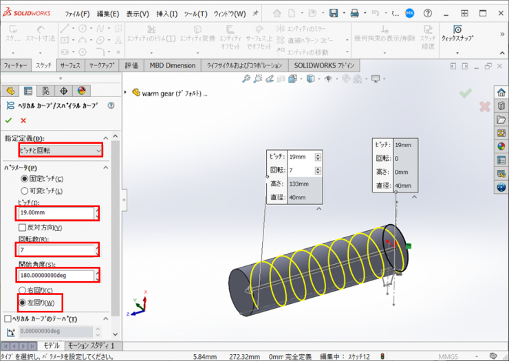 ③【ピッチと回転】を選択し、【固定ピッチ】、ピッチ:【19mm】、回転数:【7】、開始角度:【180deg】、【左回り】を設定し、【OK】をクリックするとヘリカルカーブが作成されます。