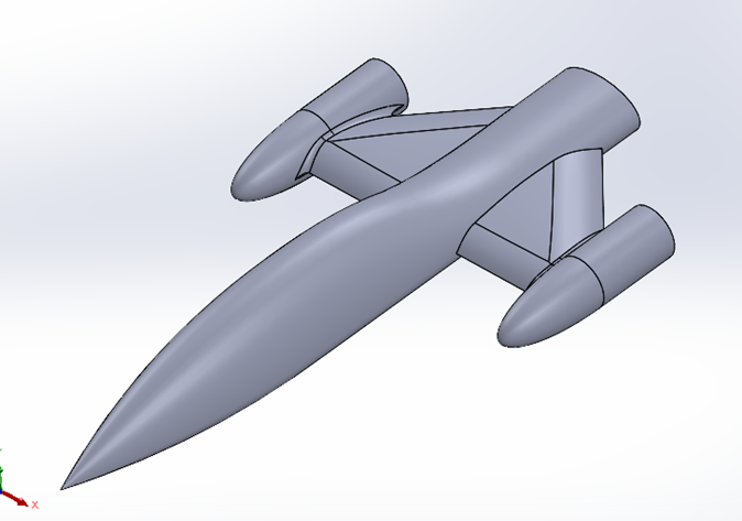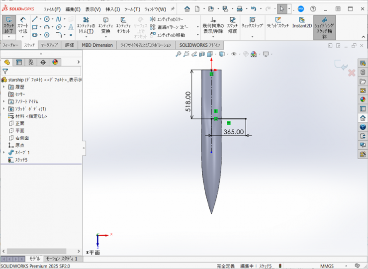 22.ウィングの先端の平面に新規のスケッチを開始し、エンジンの輪郭を作図します。
