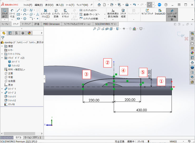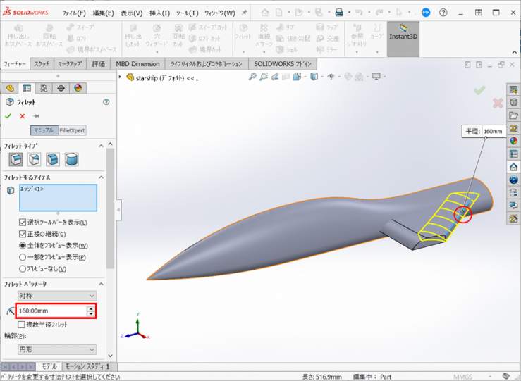 21.同様にウィングの後方にR160mmのフィレットを作成します。