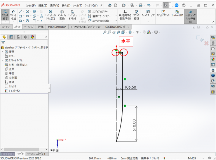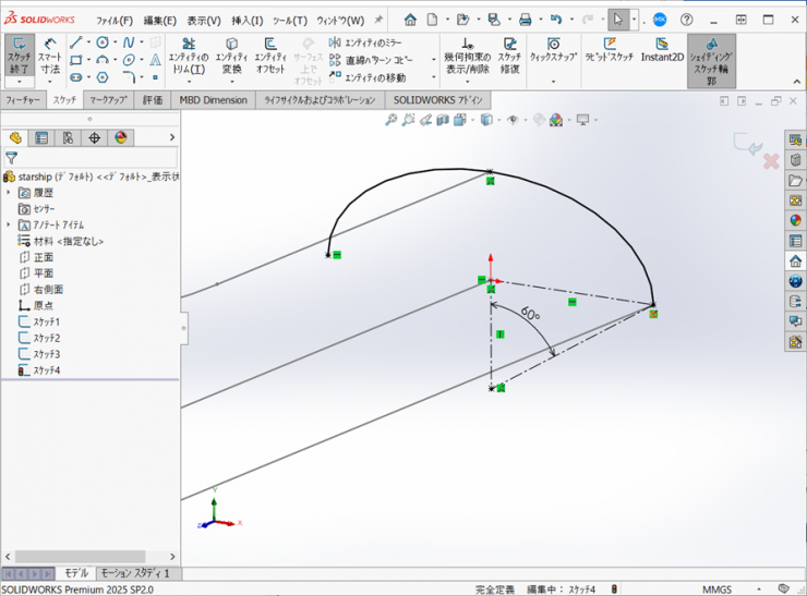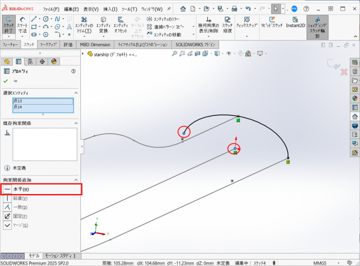 円弧と直線はそれぞれ【正接】の拘束を付けます。