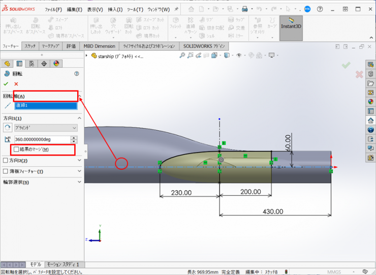 23.フィーチャータブの【回転 ボス/ベース】をクリックします。