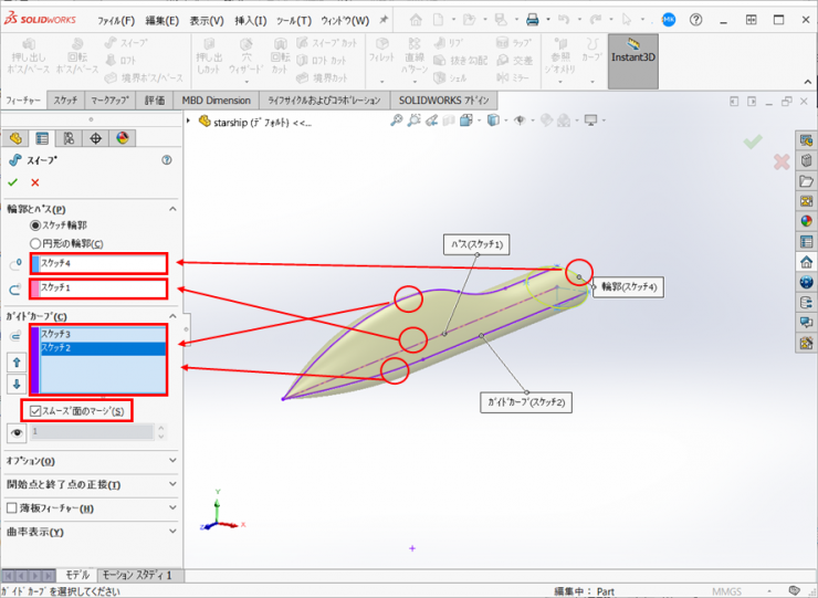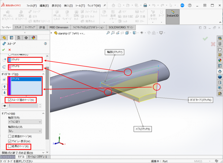 輪郭:17.で作成したスケッチ、パス:13.で作成したスケッチ、ガイドカーブ:15.で作成したスケッチを選択します。ガイドカーブの【スムーズ面のマージ】にチェックを入れ、オプションの【結果のマージ】のチェックを外します。開始点の正接、終了点の正接をともに【なし】に設定します。