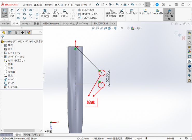 ※原点を通り、13.で作図したパスの端点と端点に【鉛直】の拘束を付け、距離152mmの直線を作図します。