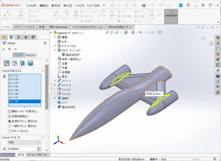 26.ウィングとエンジンの間に15mmのフィレットを作成します。