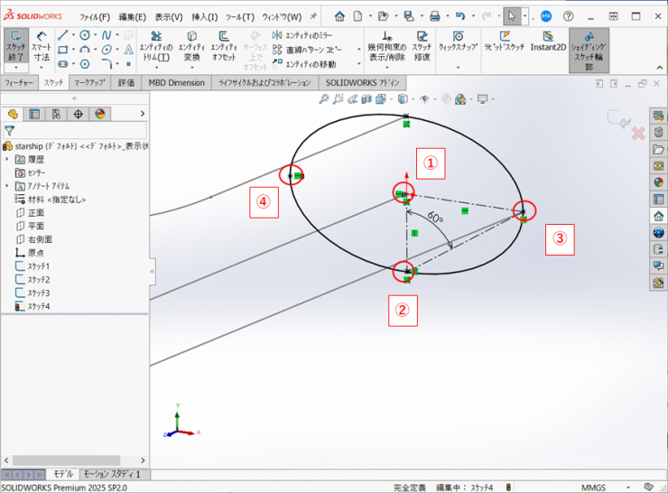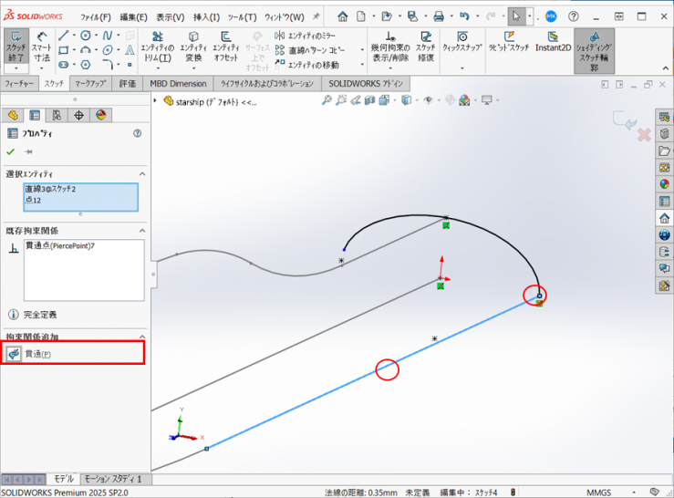 楕円子の端点と4.で作図したスケッチの直線を選択し、【貫通】の拘束を付けます。