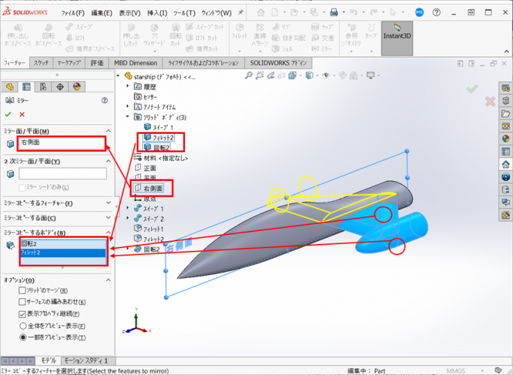 ミラーコピーするボディで、ウィングとエンジンのボディをFeacherManagerデザインツリーもしくはモデルをクリックし、選択して【OK】をクリックします。