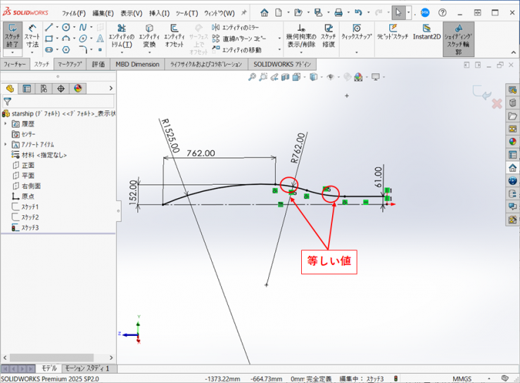 右側2つの円弧は【等しい値】の拘束を付けます。