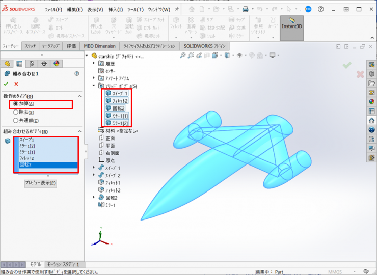 【加算】を選択し、すべてのボディをFeacherManagerデザインツリーもしくはモデルから選択し、【OK】をクリックします。