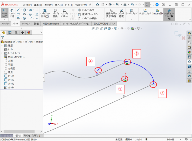 15.平面に新規のスケッチを開始し、ウィングの後縁のガイドカーブを作図します。