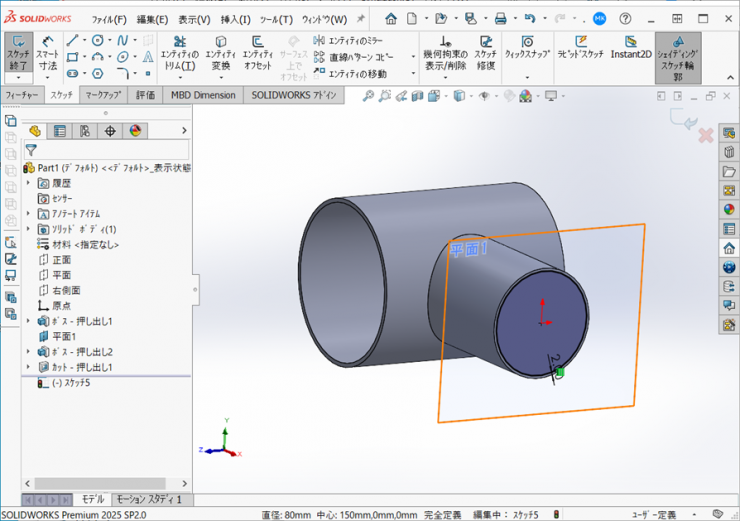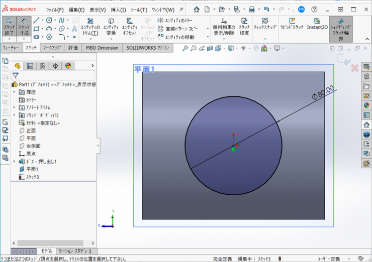 8.7.で作成した平面に新規のスケッチを開始し、原点を中心としたφ80の円を作図します。