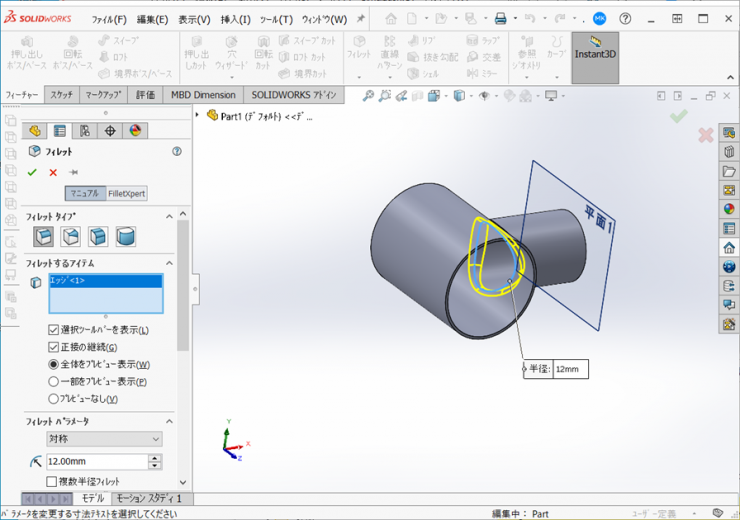 19.同様に、φ120とφ80のパイプの内側のつなぎ目のエッジを選択し、R12のフィレットを作成します。