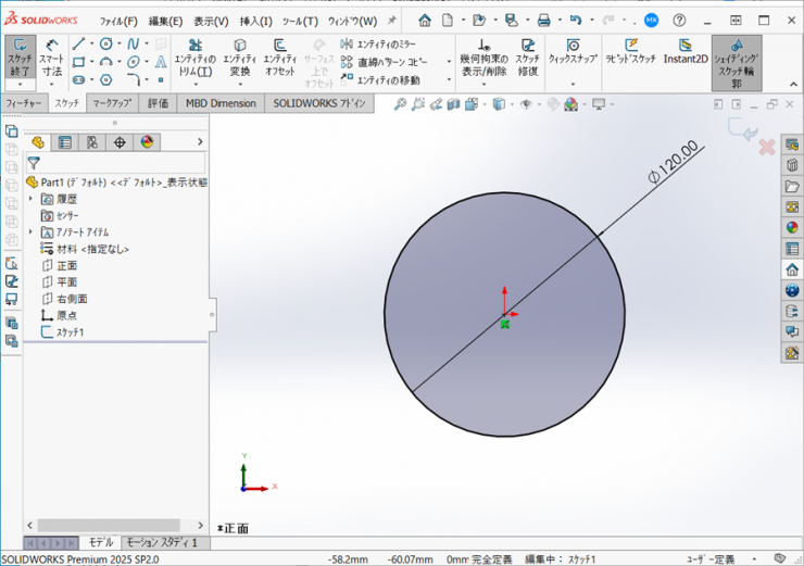 4.平面に新規のスケッチを開始し、原点を中心としたφ120の円を作図します。