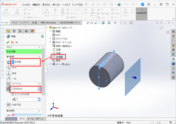 FeatureManagerデザインツリーから【右側面】を選択し、オフセット距離に【150mm】を入力し、