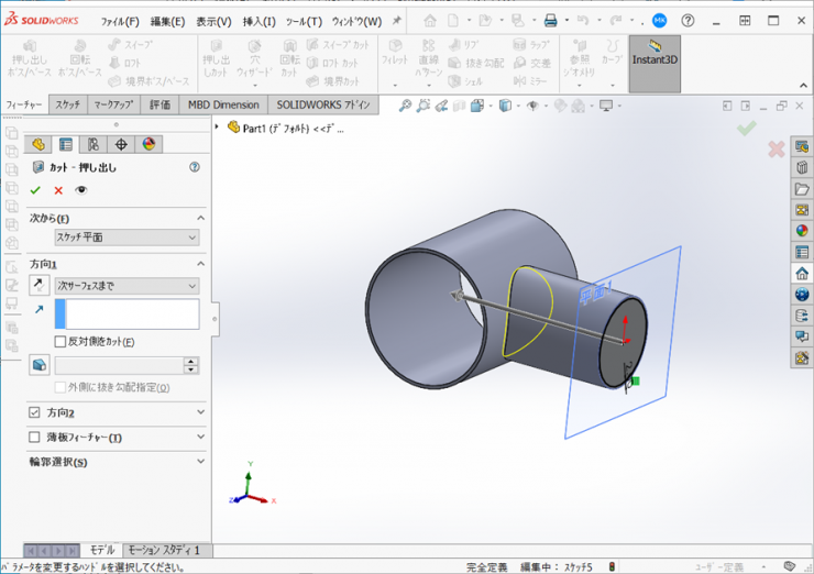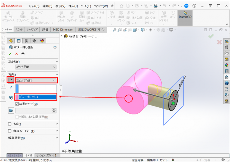10.押し出し状態を【次のボディまで】にし、6.で作成したボディを指定し、【OK】をクリックします。
