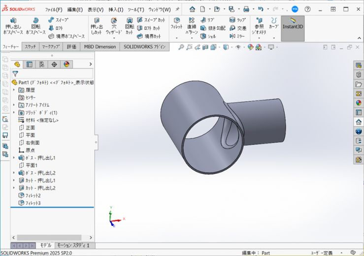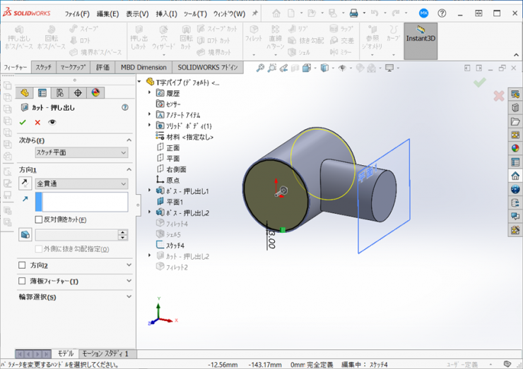 ※2つのパイプの厚さが同じ場合は、手順10.の後、フィレットを作成し、シェルコマンドで、簡単に作成できます。