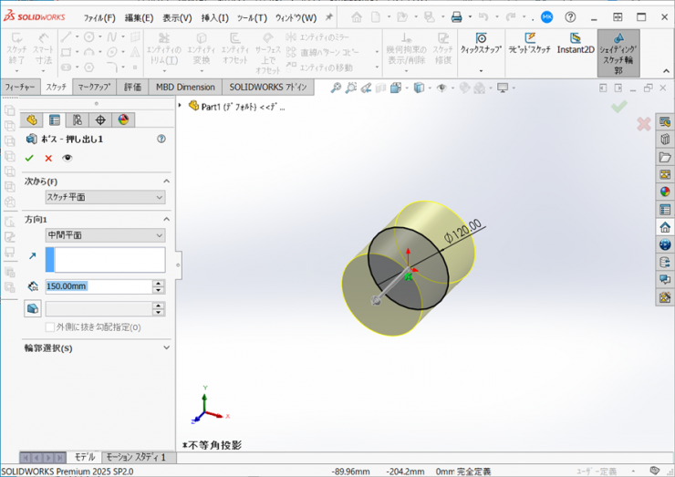 6..押し出し状態を【中間平面】にし、深さ/厚みに【150mm】を入力し、【OK】をクリックします。