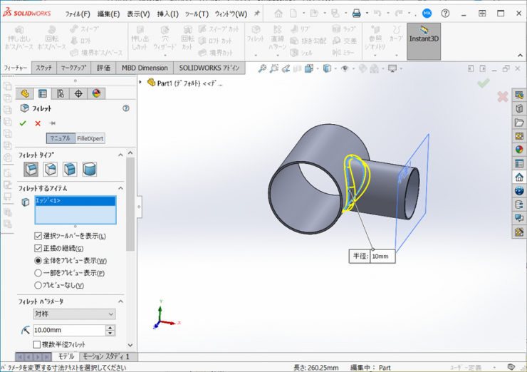 18.φ120とφ80のパイプの外側のつなぎ目のエッジを選択し、R10のフィレットを作成します。