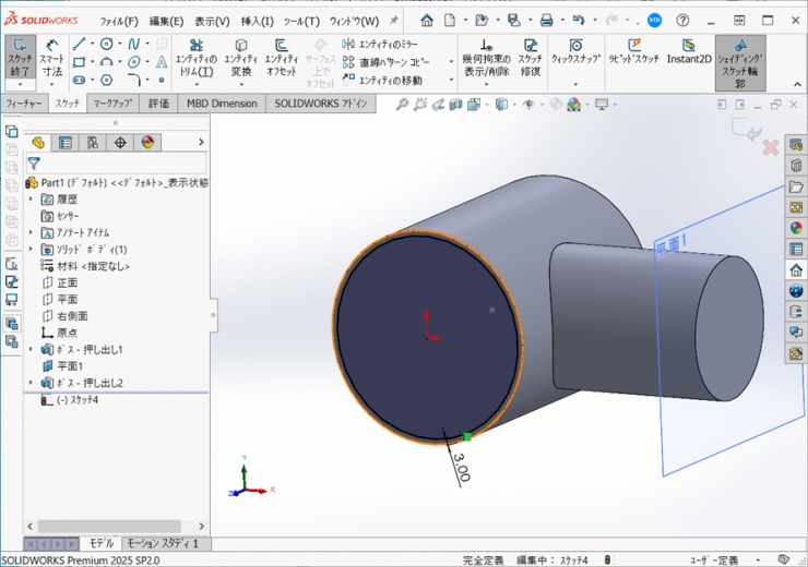 11.φ120の円筒に穴をあけます。Φ120の円筒の端面にスケッチを開始し、外形を3mmエンティティオフセットした円を作図します。