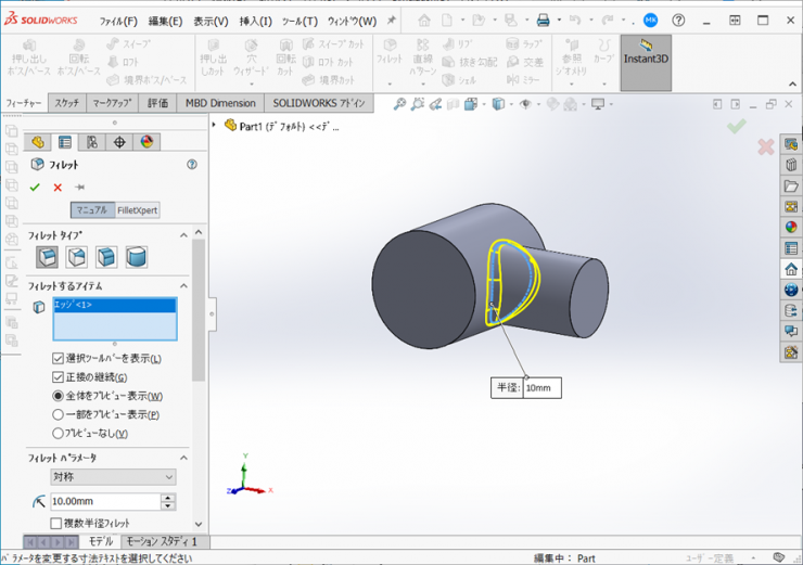 フィーチャータブの【フィレット】のアイコンをクリックします。