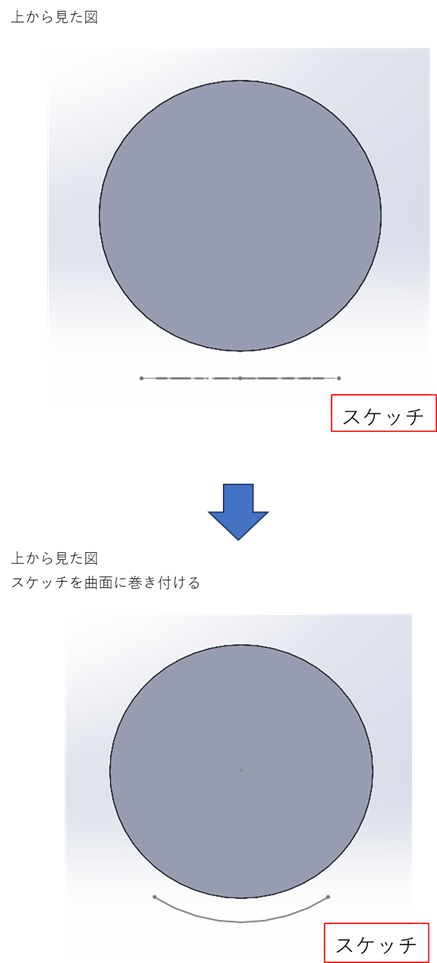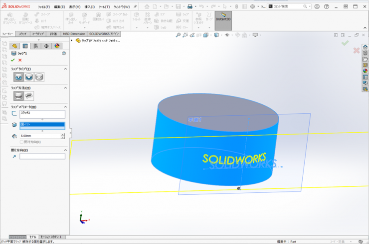 「ラップ」は、スケッチした図形を中心から円周方向に広がるように押し出すことで、曲面に沿った加工が可能です。