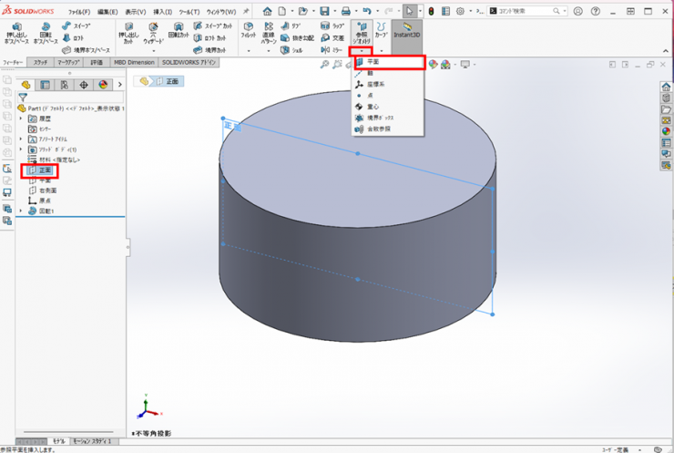 6.Feature Managerデザインツリーから、【正面】を選択し、フィーチャータブの参照ジオメトリアイコンの下の▼をクリックし、【平面】をクリックします。