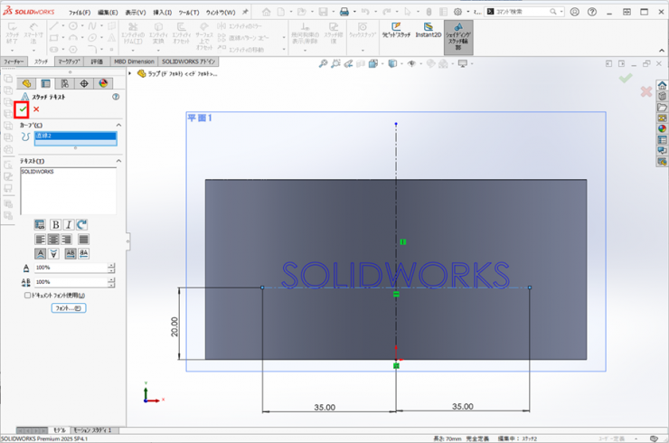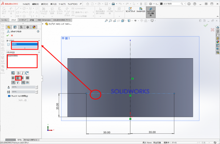 ③カーブに水平線を選択し、テキストに【SOLIDWORKS】と入力します。