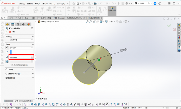 深さ/厚みに、【100mm】を入力し、【OK】をクリックします。