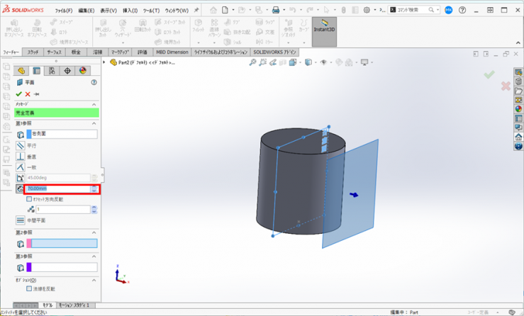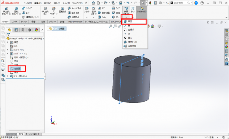 6.Feature Managerデザインツリーから、【右側面】を選択し、フィーチャータブの参照ジオメトリアイコンの下の▼をクリックし、【平面】をクリックします。