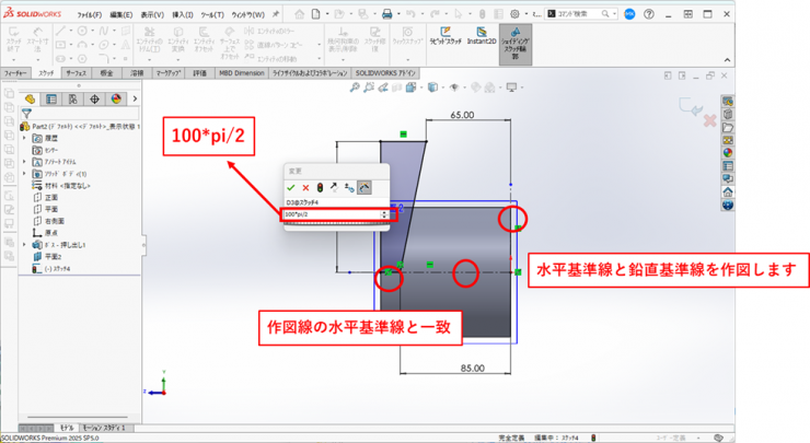 鉛直線の長さ(0度~180度)は、半円の周長になりますので、直径×φ(3.1415)/2ですが、φはSOLDIWORKSの変数【pi】を使用し、【100*pi/2】と入力します。