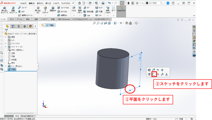 ①モデルの上面をクリックし、新規スケッチを開始します。