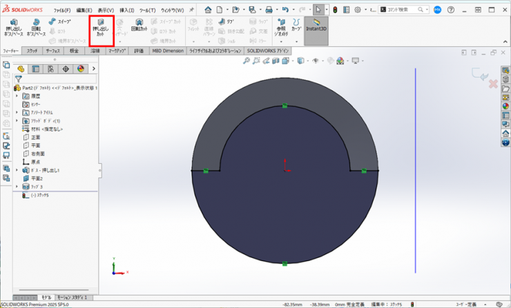 ③上面のエッジがエンティティ変換されます。フィーチャータブにある【押し出しカット】アイコンをクリックします。