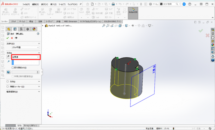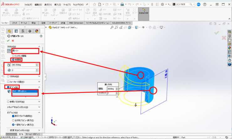 ②パターン軸に円筒面の内側の面を選択、【等間隔】、角度:【360deg】、インスタンス数:【2】ボディにチェックを入れ、カットしたボディを選択します。
