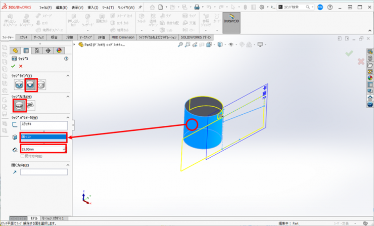 10.ラップフィーチャーで、展開図を円筒から15mmカットします。