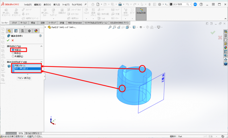 ②【加算】を選択し、2つのボディを選択し、【OK]をクリックします。