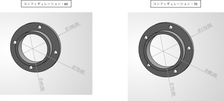 7.下図のようにコンフィギュレーション「60」で、管の直径が外側から「φ100」、「φ70」、「φ60」、穴の数を「4個」、コンフィギュレーション「70」で、管の直径が外側から「φ110」、「φ80」、「φ70」、穴の数を「5個」に変更します。