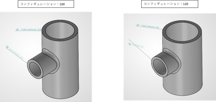 6.下図のようにコンフィギュレーション「120」で、管の直径を「φ100」、「φ60」を「φ120」、「φ70」に変更します。